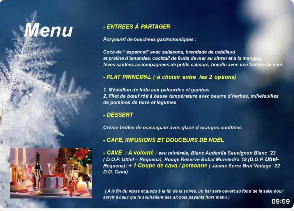 Grâce à un immense effort de prise en charge par notre association (c´est Noël…merci Raymond !), le coût de la participation à la soirée a été fixé à seulement 35 euros pour les adhérents, et à 50 euros pour les non adhérents.
